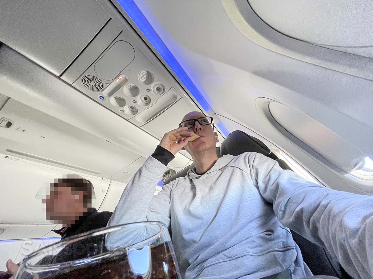 I can’t recall what all of the menu options were, but the person sitting next to me had the breakfast tacos. They looked (and smelled) good! It’s worth noting that the portion sizes are a bit smaller than what you would get on other airlines.
