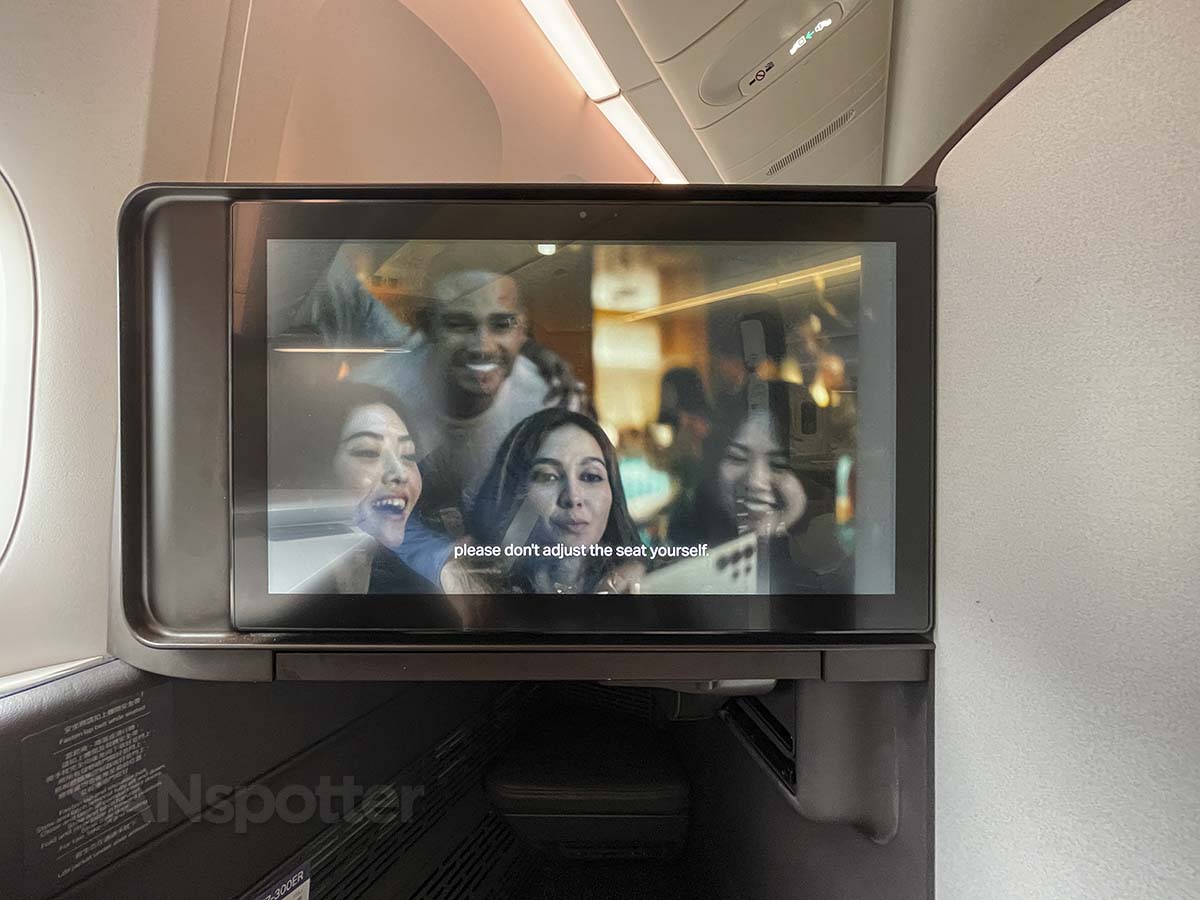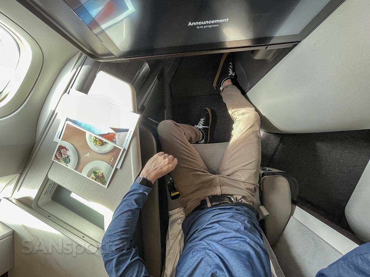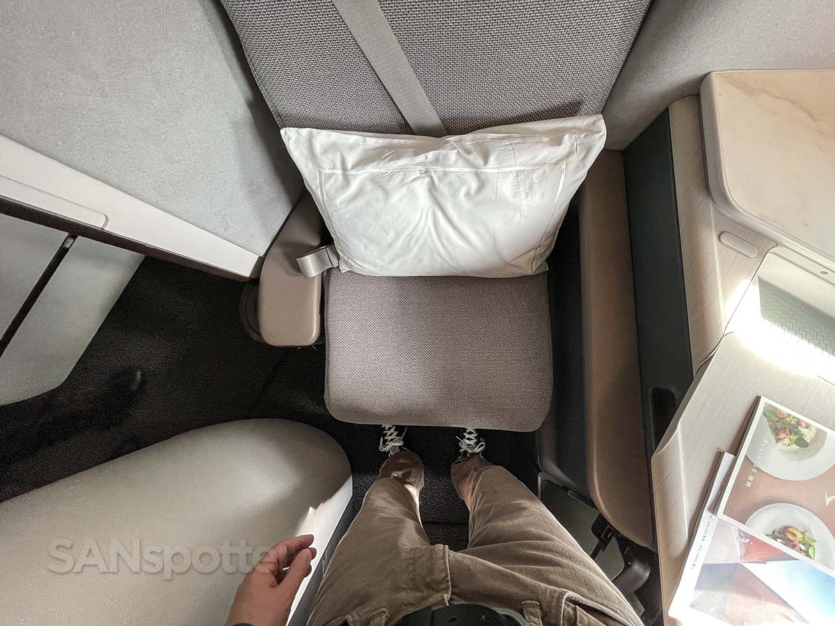 Seat 14A. I wonder if it’s as happy to see me as I am happy to see it? Probably not. My only criticism so far is that the pillow looks boring AF compared to the one I smothered with my buttocks sat on in EVA Air 787-9 business class. It’s like they didn’t even try.I declare “takes backsies” on my previous comment (at least the part about not trying). The pillows may be boring, but gosh darn it if they didn’t try real hard to make this seat as awesome as possible. Success!Legroom is excellent. However, if Cathy is anything like Karen, I think she’d have a lot to say about how tight the footwell space is. I don’t blame her actually. These videos screens are huge (and I like it!), but I’m not so sure but I’m a fan of everyone laughing at me for trying to adjust the seat myself. Look at me go adjusting the seat all by myself. F what everyone else thinks of me. Speaking of everyone else (at least the ones sitting around me), I can’t speak for them because I can’t see them. Privacy is excellent in these seats.