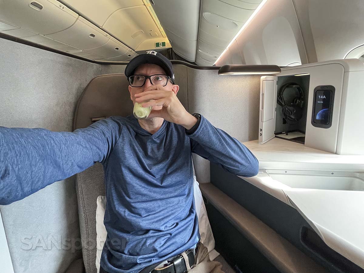 Disagree with me all you want, but I am 100% certain that the sliding privacy door in business class will go down in history as one of the best inventions since the lightbulb. Social interaction with other human beings is scary. And annoying!The placement of the touchscreen seat control panel is just about perfect IMHO. You’re basically always just one finger flick away from “lay this b*tch down (LTBD)” mode.FYI, LTBD mode is sometimes referred to as RIP mode (because I’m pretty sure this is what I’m going to look like at my own funeral – baseball cap and all).