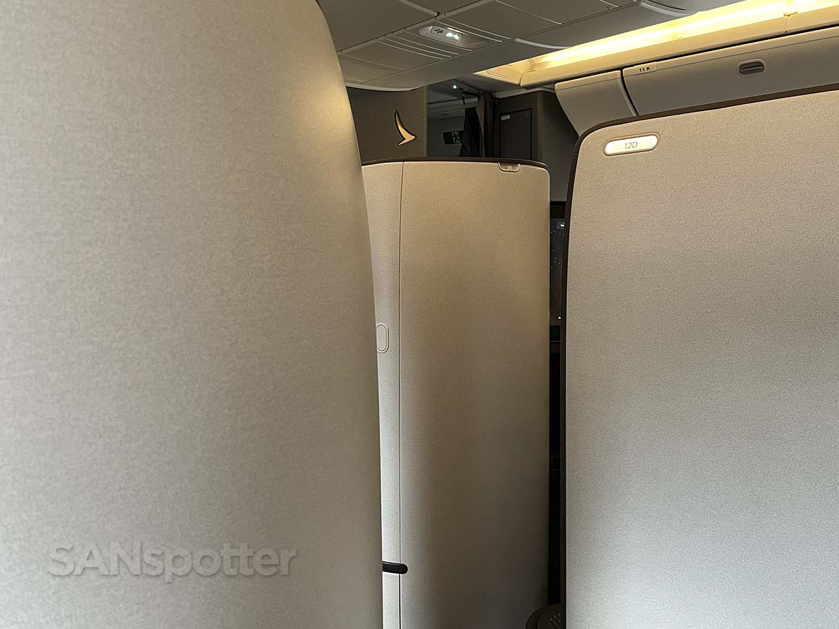 Business class on the long haul Cathay Pacific 777-300ER is arranged in a 1-2-1 layout. The seats themselves are fully enclosed suites (what they call “Aria Suites”) with sliding privacy doors. It’s awfully nice.