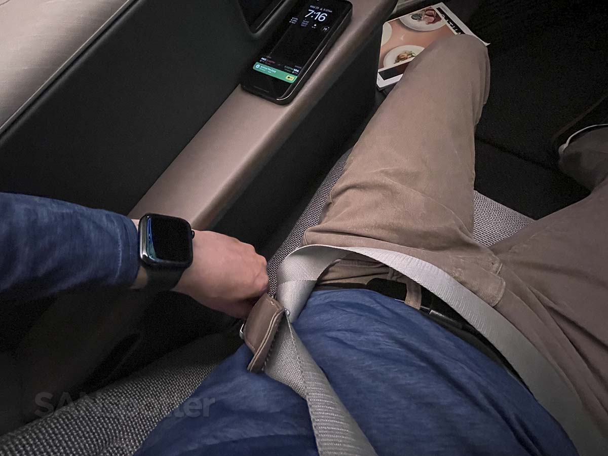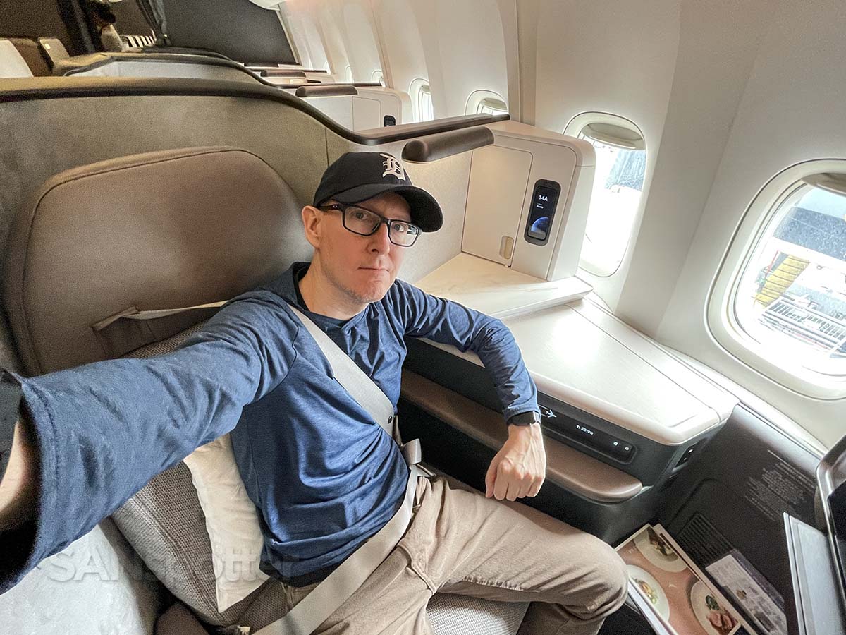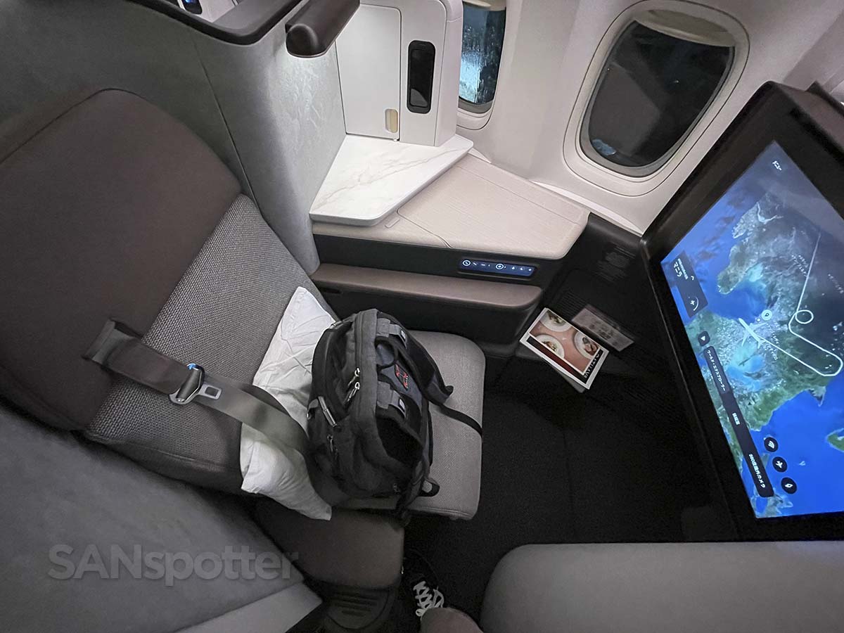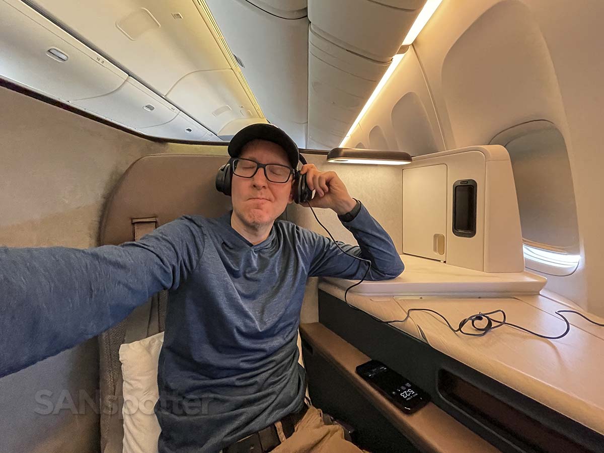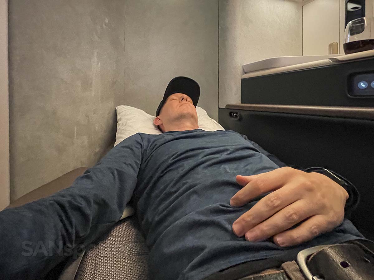 These are fully lie flat seats (with a privacy door) that are fairly comfortable in most positions. The padding is a bit firm, but it’s better than being a bit too soft IMHO. That’s what she said…