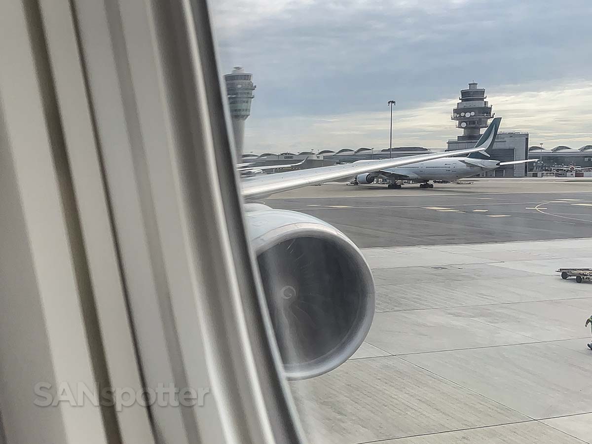 Detached. Unhooked. Pushing back. Going places. Close enough to being on time too!“His eyes snapped to the window as the 777-300ER lumbered toward the runway, and there it was: something glinting in the distance, so compelling it sent a jolt through him, demanding his full attention.”What he saw was a Cathay Pacific A350-900 (of course). These things are rad.